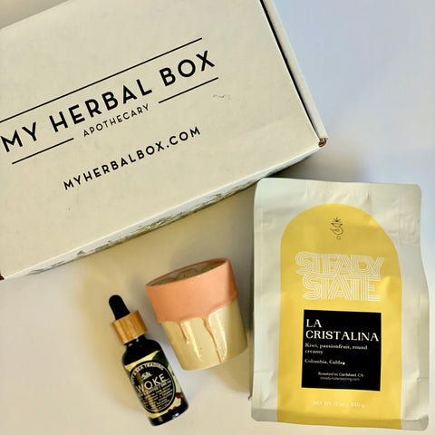 This box is THE box for mums who love their coffee in the morning. This coffee is from a local roaster here in Carlsbad and has won awards for Best Coffee Roaster at multiple competitions. It also comes with the cutest little handmade mug also from a local pottery studio in Carlsbad. Last but not least, it comes with a Hemp & Coffee full spectrum extract from a small organic farm. This is the ultimate gift for a coffee lover!